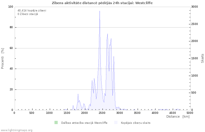 Pārskats par lokalizācijas attiecību pret attālumu no stacijas. Kopējais zibeņu skaits distancēs arī ir parādīts.