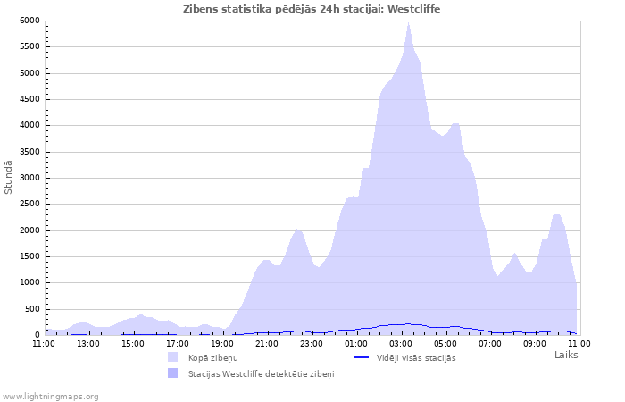 Visa tīkla noteikto zibens izlāžu dinamika pa stundām, stacijā Westcliffe noteikto zibeņu skaits stundā un vidējais zibeņu skaits vienā stacijā.