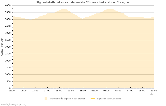 Het aantal ontvangen signalen per uur van station Cocagne en de gemiddelde waarde van alle stations.