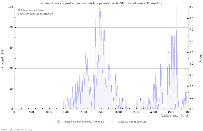 Přehled vlastního lokalizačního poměru ke vzdálenosti od stanic. Celkový počet blesků na vzdálenost je také zobrazen.