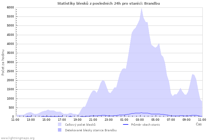 Zde najdete celkový počet blesků za hodinu detekovaný v celé síti, počet blesků za hodinu ze stanice Brandbu a průměrný počet blesků ze všech stanic.