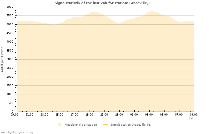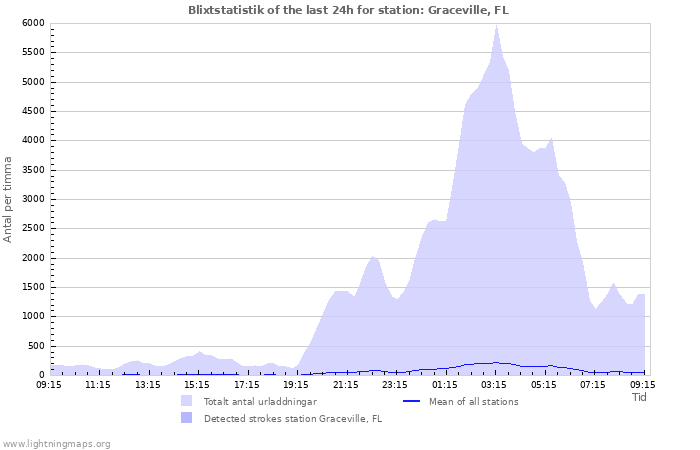 Here you can see the whole stroke count per hours detected by the lightning network, the count of detected strokes/h of the station Graceville, FL and the mean stroke count for all stations
