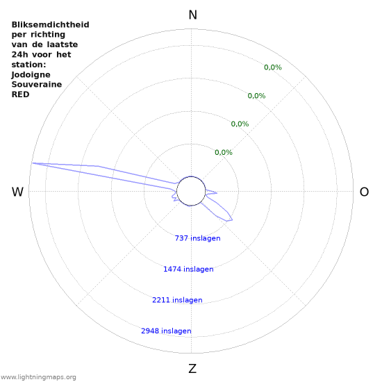 Overzicht van de eigen locatie detectiegegevens in functie van de richting. Aantal gedetecteerde inslagen is ook zichtbaar.