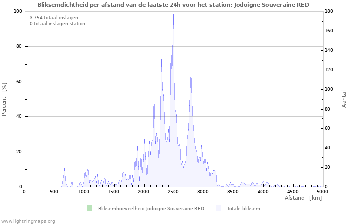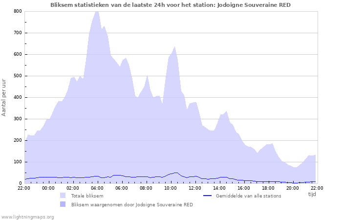 Hier het aantal inslagen per uur gedetecteerd door het netwerk, het aantal inslagen per uur gedetecteerd door het station Jodoigne Souveraine RED en het gemiddelde aantal inslagen per uur gedetecteerd door alle stations