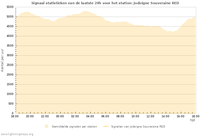 Het aantal ontvangen signalen per uur van station Jodoigne Souveraine RED en de gemiddelde waarde van alle stations.