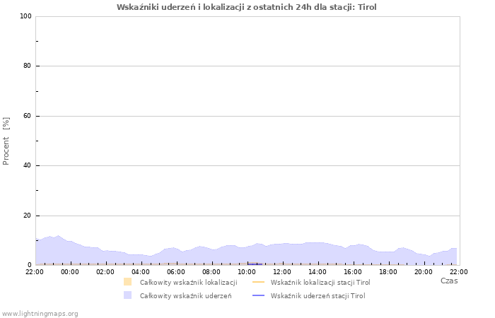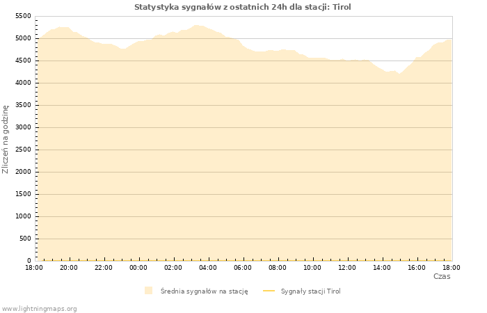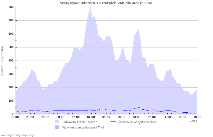 Tutaj można zmobaczyć całkowitą liczbę uderzeń na godzinę wykrytą przez sieć detektorów, liczbę wykrytych uderzeń/h stacji Tirol i śrenią liczbę uderzeń dla wszytkich stacji