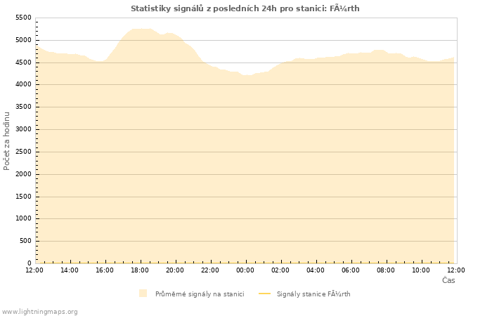 Počet obdržených signálů za hodinu ze stanice Fürth a také průměrná hodnota ze všech stanic.