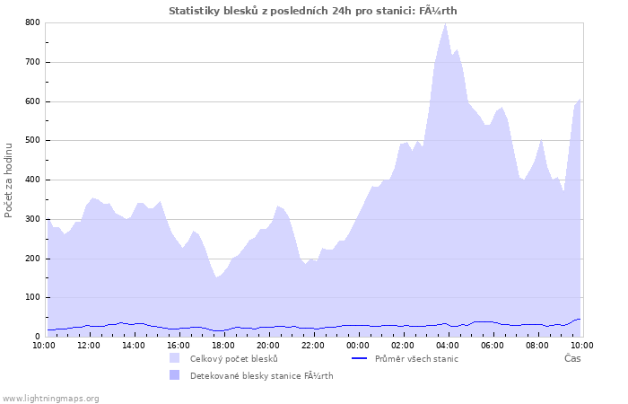 Zde najdete celkový počet blesků za hodinu detekovaný v celé síti, počet blesků za hodinu ze stanice Fürth a průměrný počet blesků ze všech stanic.