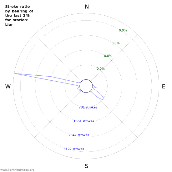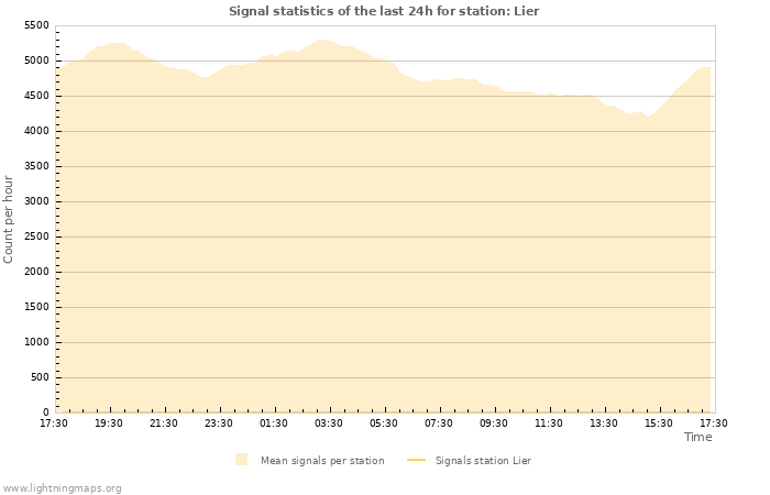 Here you can see the whole stroke count per hours detected by the lightning network, the count of detected strokes/h of the station Lier and the mean stroke count for all stations