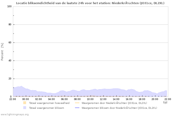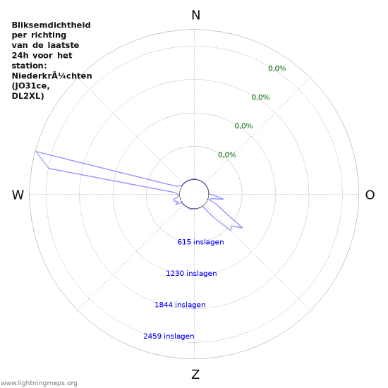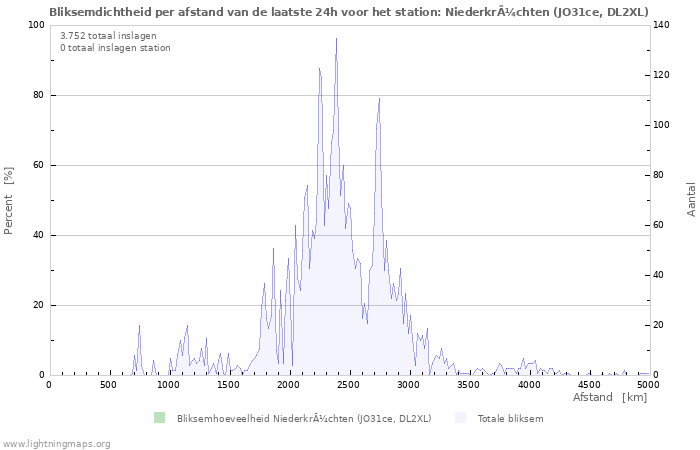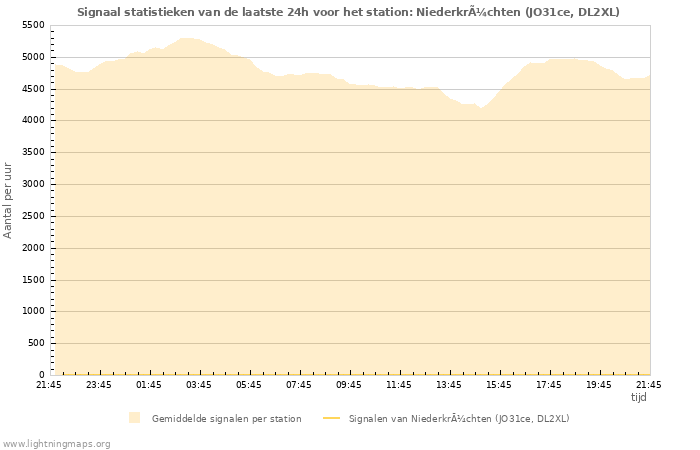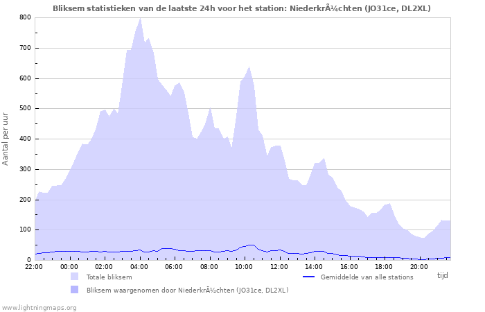 Hier het aantal inslagen per uur gedetecteerd door het netwerk, het aantal inslagen per uur gedetecteerd door het station Niederkrüchten (JO31ce, DL2XL) en het gemiddelde aantal inslagen per uur gedetecteerd door alle stations