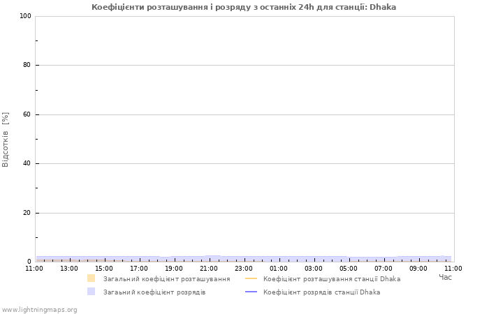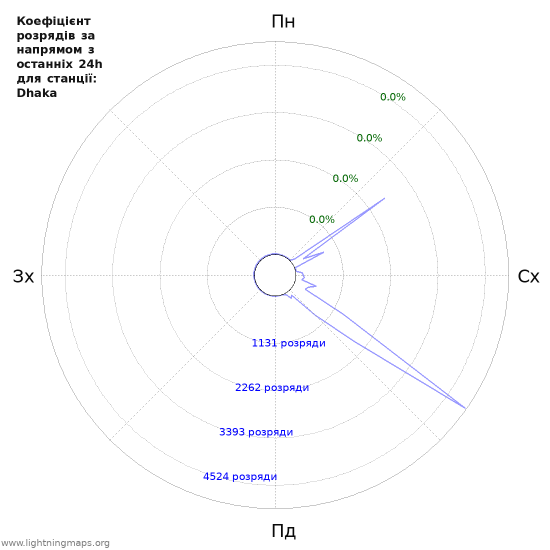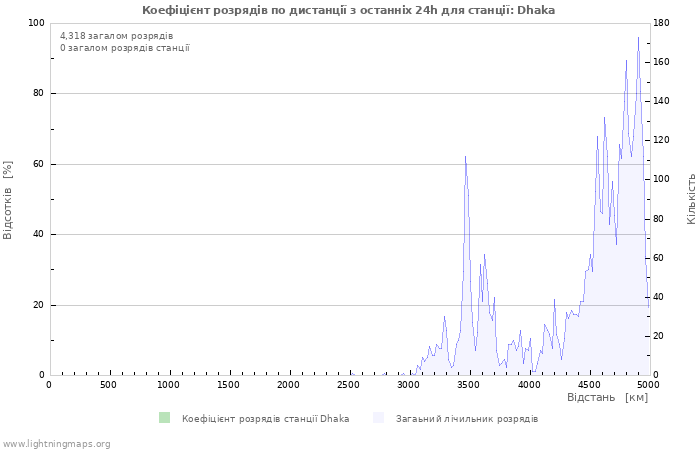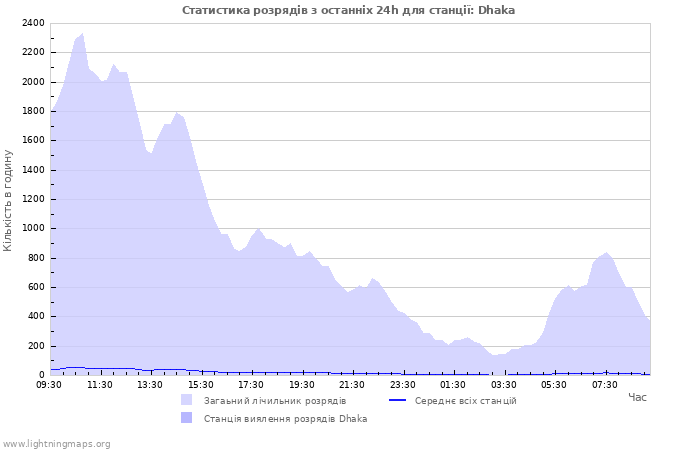 Тут ви можете побачити загалну кількість розрядів за кілька годин виявлених у мережі блискавок, кількість виявлених розрядів на годину станції Dhaka і середня кількість розрядів для всіх станцій