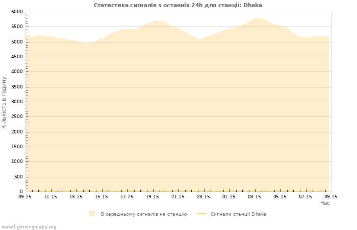 Кількість прийнятих сигналів на годину станції Dhaka а також середнє значення по всіх станціях.