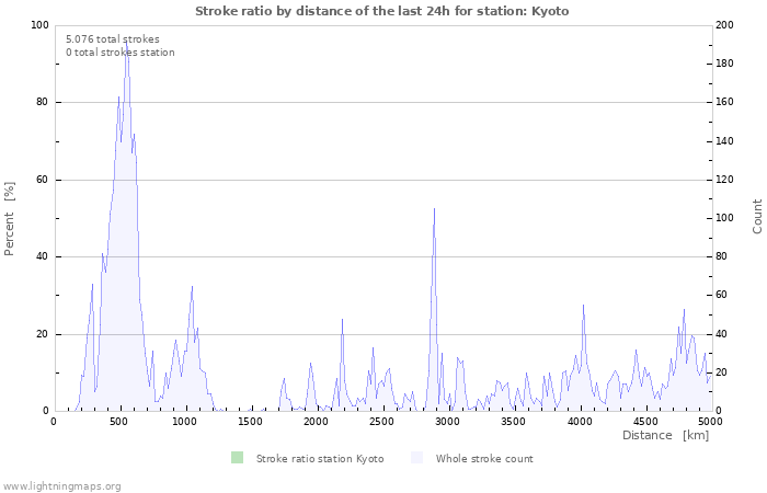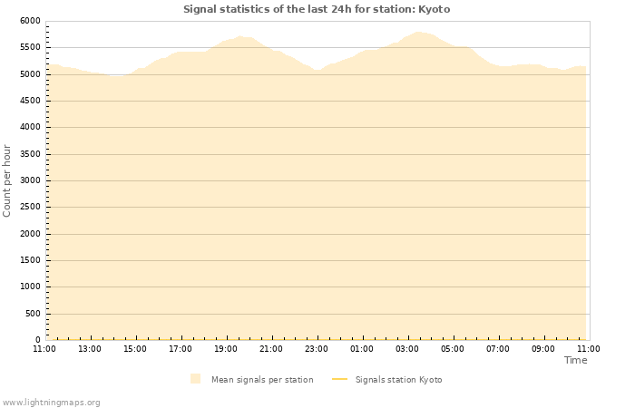 Here you can see the whole stroke count per hours detected by the lightning network, the count of detected strokes/h of the station Kyoto and the mean stroke count for all stations