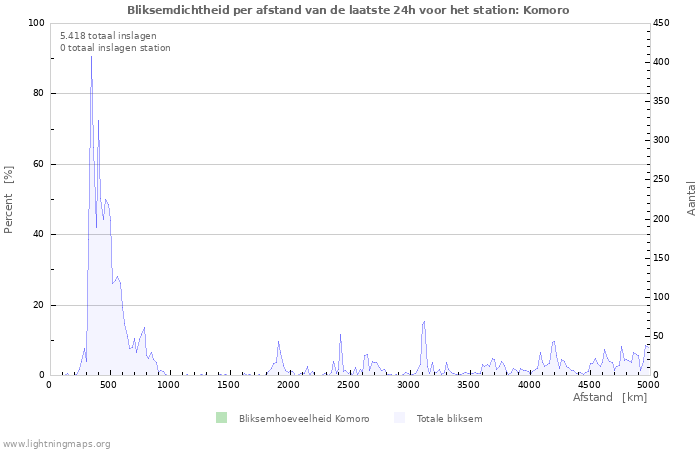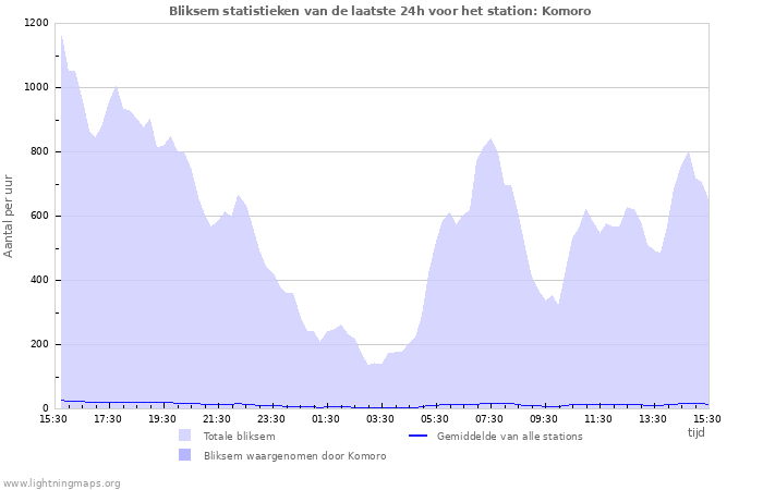Hier het aantal inslagen per uur gedetecteerd door het netwerk, het aantal inslagen per uur gedetecteerd door het station Komoro en het gemiddelde aantal inslagen per uur gedetecteerd door alle stations