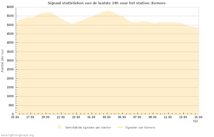 Het aantal ontvangen signalen per uur van station Komoro en de gemiddelde waarde van alle stations.