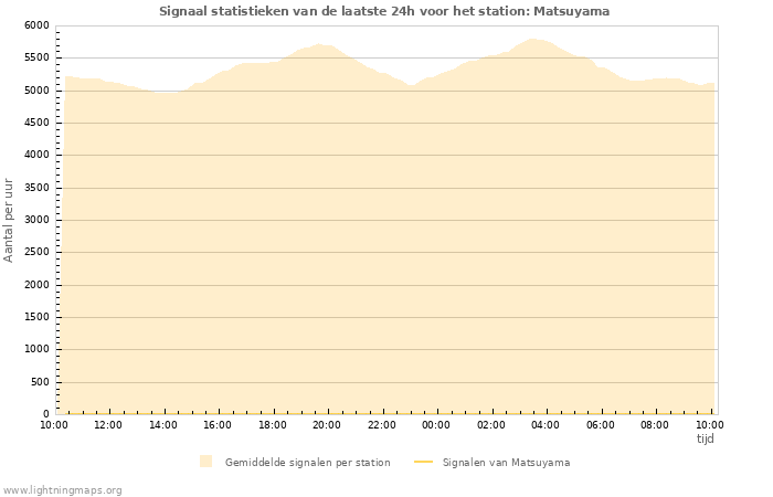 Het aantal ontvangen signalen per uur van station Matsuyama en de gemiddelde waarde van alle stations.