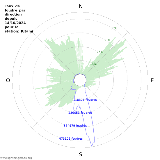 Ce graphique représente le taux de foudre en fonction de l'orientation géographique depuis la mise en service de la station