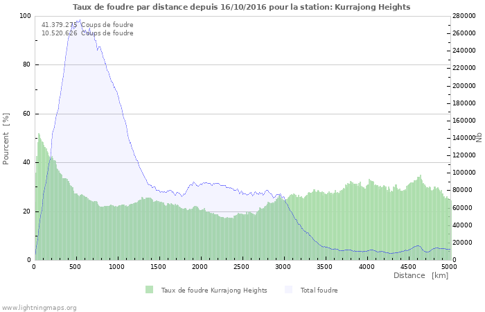 Ce graphique représente le taux de foudre en fonction de la distance depuis la mise en service de la station