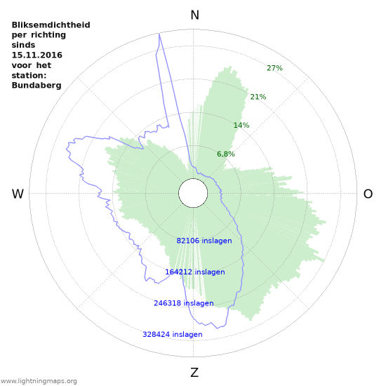 Deze grafiek toont de hoeveelheid inslagen in functie van de richting sinds de start van het station.