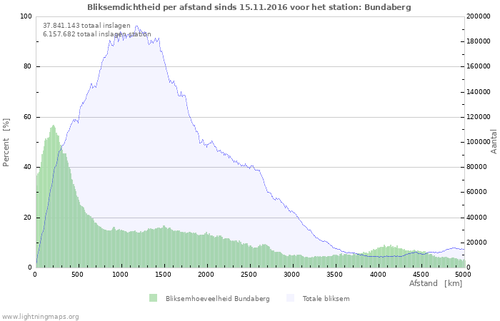 Deze grafiek toont de hoeveelheid inslagen in functie van de afstand sinds de start van het station.