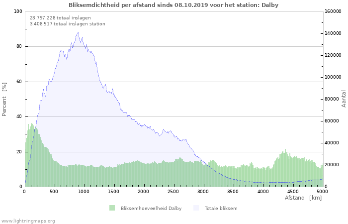 Deze grafiek toont de hoeveelheid inslagen in functie van de afstand sinds de start van het station.