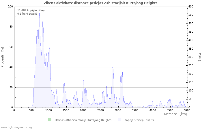 Pārskats par lokalizācijas attiecību pret attālumu no stacijas. Kopējais zibeņu skaits distancēs arī ir parādīts.