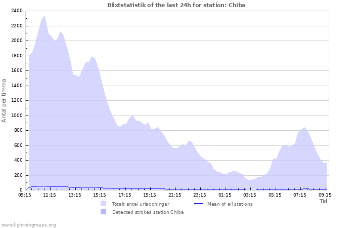Here you can see the whole stroke count per hours detected by the lightning network, the count of detected strokes/h of the station Chiba and the mean stroke count for all stations