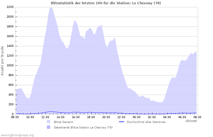 Zu sehen ist die Gesamtanzahl an Blitzen pro Stunde aus dem Ortungsnetzwerk, die Anzahl der detektierten Blitze der Station Le Chesnay (78) sowie zum Vergleich der Durchschnitt aller Stationen.