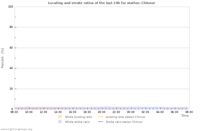Here you can see the whole stroke count per hours detected by the lightning network, the count of detected strokes/h of the station Chinnor and the mean stroke count for all stations
