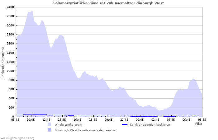 Here you can see the whole stroke count per hours detected by the lightning network, the count of detected strokes/h of the station Edinburgh West and the mean stroke count for all stations
