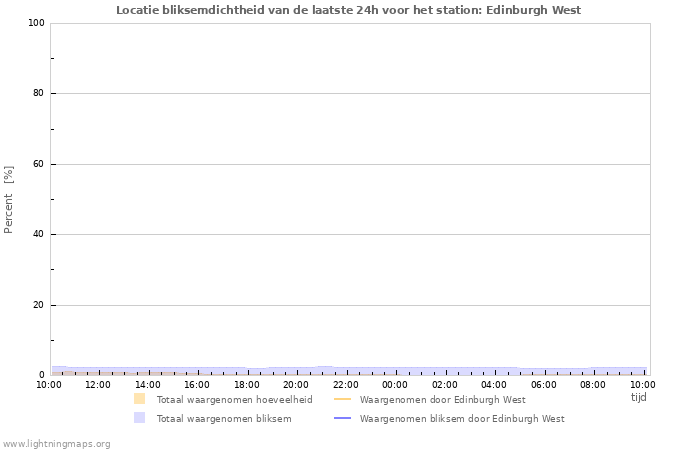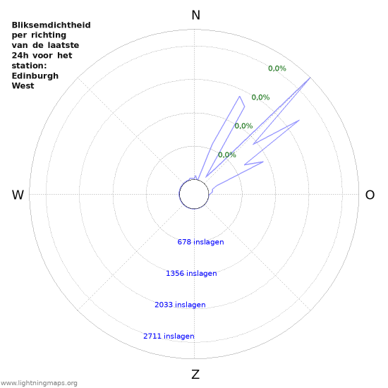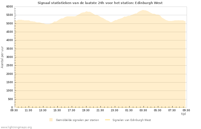 Hier het aantal inslagen per uur gedetecteerd door het netwerk, het aantal inslagen per uur gedetecteerd door het station Edinburgh West en het gemiddelde aantal inslagen per uur gedetecteerd door alle stations