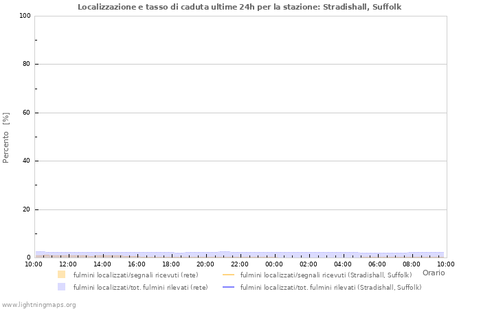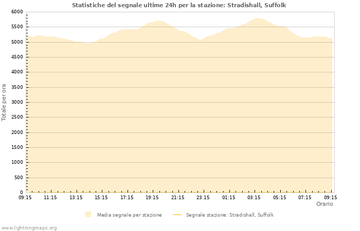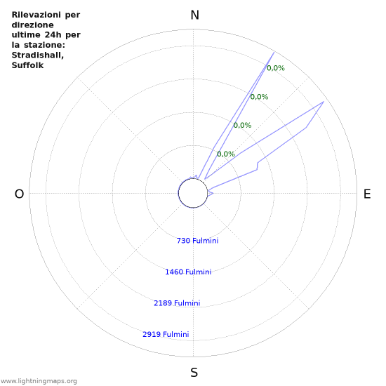 Il grafico riporta il totale delle fulminazioni per ora dell'intera rete, e della stazione di Stradishall, Suffolk.