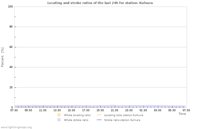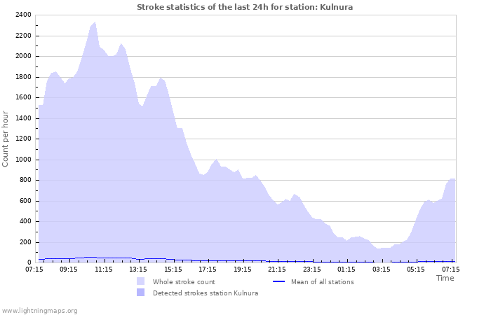 Here you can see the whole stroke count per hours detected by the lightning network, the count of detected strokes/h of the station Kulnura and the mean stroke count for all stations
