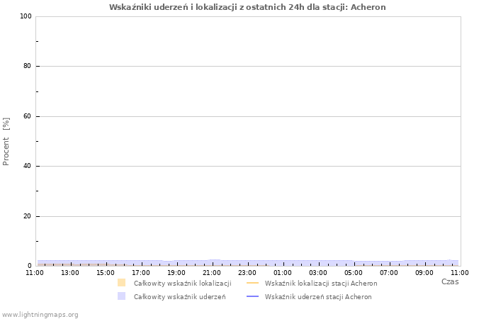 Tutaj można zmobaczyć całkowitą liczbę uderzeń na godzinę wykrytą przez sieć detektorów, liczbę wykrytych uderzeń/h stacji Acheron i śrenią liczbę uderzeń dla wszytkich stacji