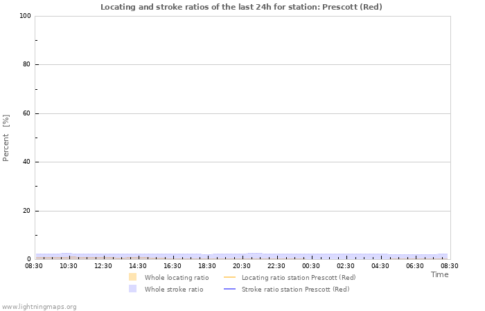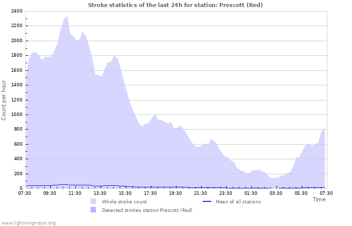 Here you can see the whole stroke count per hours detected by the lightning network, the count of detected strokes/h of the station Prescott (Red) and the mean stroke count for all stations