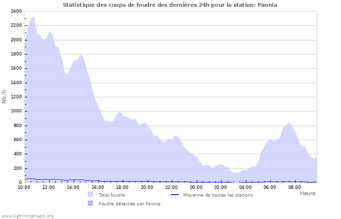 Ici vous pouvez voir la totalité des coups de foudre comptabilisés par le réseau Blitzortung, la quantité de coups de foudre par heure de la station Paonia ainsi que qté moyenne des coups foudre de toutes les autres stations