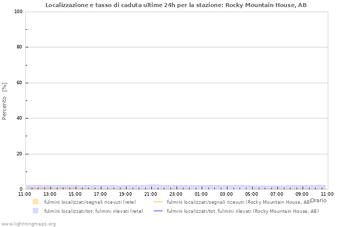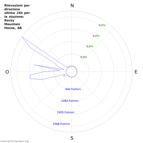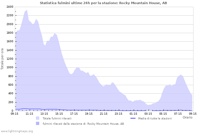 Il grafico riporta il totale delle fulminazioni per ora dell'intera rete, e della stazione di Rocky Mountain House, AB.