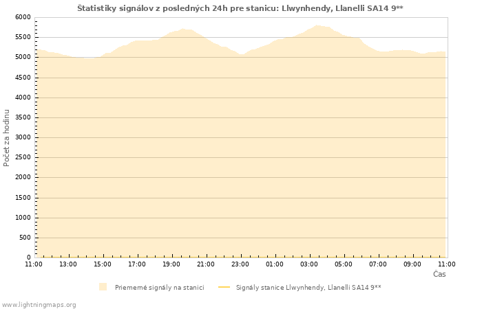 Počet prijatých signálov za hodinu zo stanice Llwynhendy, Llanelli SA14 9** a tiež priemerná hodnota zo všetkých staníc.