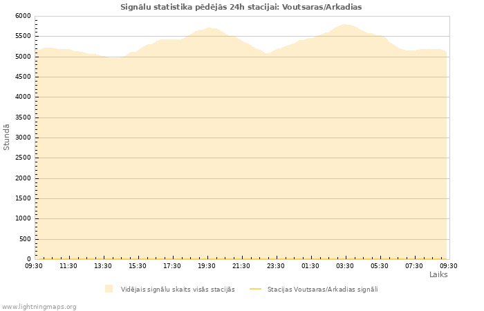 Vienā stundā saņemto signālu skaits stacijā Voutsaras/Arkadias, kā arī vidējā vērtība visās stacijās.