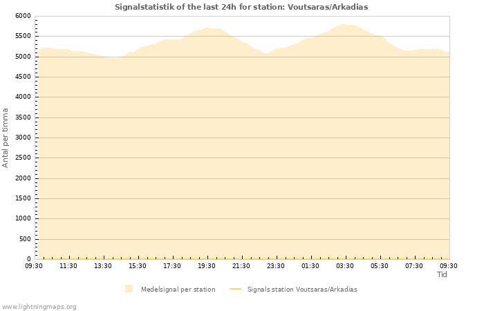 The count of received signals per hour of the station Voutsaras/Arkadias and also mean value of all stations.