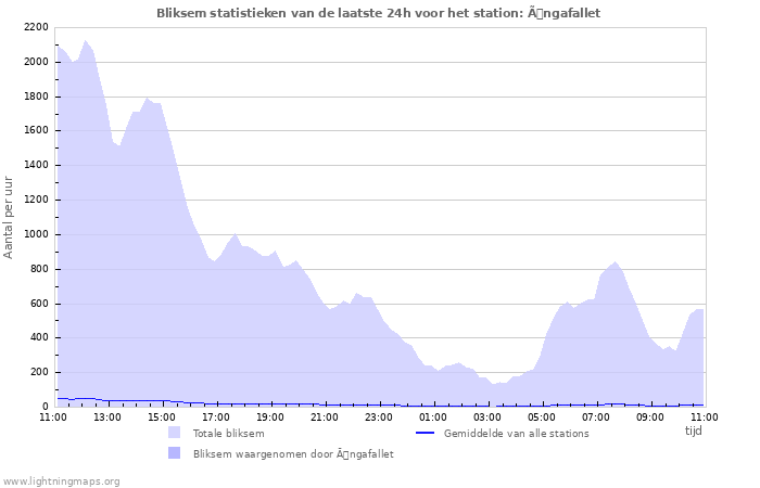 Hier het aantal inslagen per uur gedetecteerd door het netwerk, het aantal inslagen per uur gedetecteerd door het station Ãngafallet en het gemiddelde aantal inslagen per uur gedetecteerd door alle stations