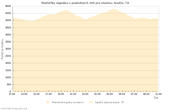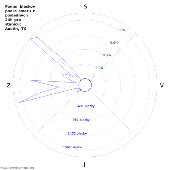 Tu nájdete celkový počet bleskov za hodinu detekovaný v celej sieti, počet bleskov za hodinu zo stanice Austin, TX a priemerný počet bleskov zo všetkých staníc.