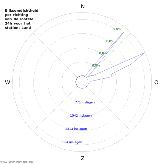Overzicht van de eigen locatie detectiegegevens in functie van de richting. Aantal gedetecteerde inslagen is ook zichtbaar.