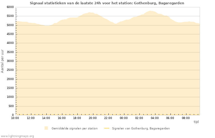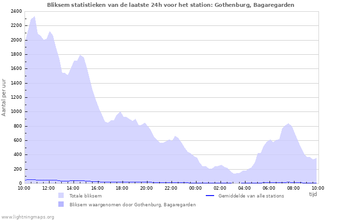 Hier het aantal inslagen per uur gedetecteerd door het netwerk, het aantal inslagen per uur gedetecteerd door het station Gothenburg, Bagaregarden en het gemiddelde aantal inslagen per uur gedetecteerd door alle stations