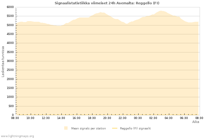 The count of received signals per hour of the station Reggello (FI) and also mean value of all stations.