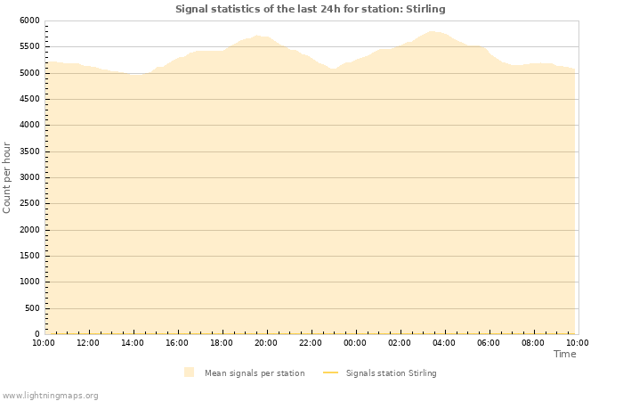 Here you can see the whole stroke count per hours detected by the lightning network, the count of detected strokes/h of the station Stirling and the mean stroke count for all stations