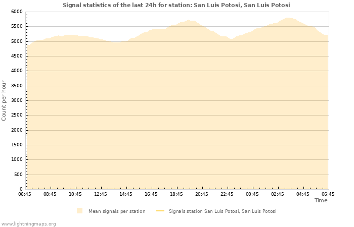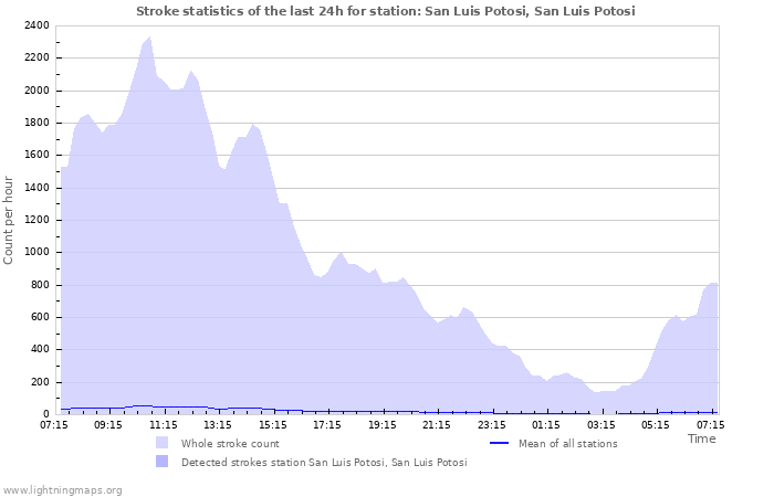 Here you can see the whole stroke count per hours detected by the lightning network, the count of detected strokes/h of the station San Luis Potosi, San Luis Potosi and the mean stroke count for all stations