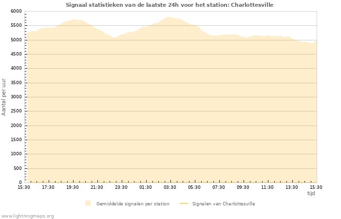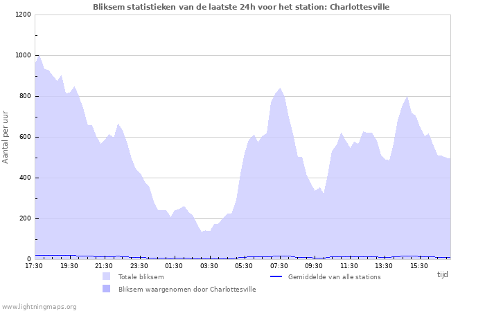 Hier het aantal inslagen per uur gedetecteerd door het netwerk, het aantal inslagen per uur gedetecteerd door het station Charlottesville en het gemiddelde aantal inslagen per uur gedetecteerd door alle stations