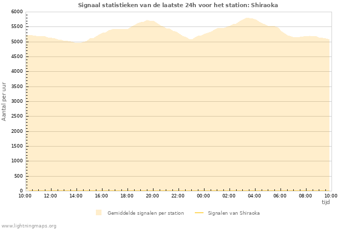 Het aantal ontvangen signalen per uur van station Shiraoka en de gemiddelde waarde van alle stations.