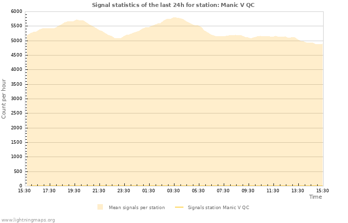 The count of received signals per hour of the station Manic V QC and also mean value of all stations.